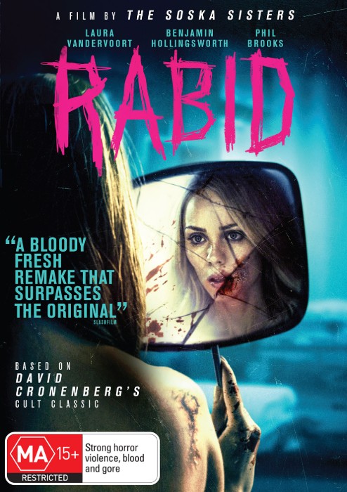 Defiant Screen Entertainment, Rated MA. Prolific Canadian genre-specialising co-directors, co-writers, co-producers and co-stars Jen and Sylvia Soska (a.k.a. ‘The Soska Sisters’ and ‘The Twisted Twins’) have made a selection of infamous shorts (Dead Hooker In A Trunk, Fight Like A Girl, Kill-Crazy Nymphos Attack) and a few features (American Mary, See No Evil 2, Vendetta), but here they aim high by trying to remake no less than David Cronenberg’s Rabid (1977). And rather mess it up too, although there’s plenty of ‘body horror’ in there, and some of it is pretty repulsive. Rose Miller (Laura Vandervoort) is an aspiring fashion designer at Haus Of Gunter, although how she earned this position is a bit of a mystery given how anti-social, bad-tempered and snarky she can often be. She’s embarrassed at a work function (where the Soskas turn up in bitchy bit parts) and rushes off, only to have a motorbike accident, just as Marilyn Chambers (a porn star of the 1970s in one of her only straight roles) did in Cronenberg’s original pic. Awakening to discover that the lower half of her face and jaw have been seriously disfigured (a convincing make-up trick), Rose retreats into seclusion before being sought out by one of those experimental medical facilities so popular in this sort of thing. Dr. William Burroughs (Ted Atherton) plays with genetics somehow (the monster-fying process was equally murky with Cronenberg too), and Rose is back to her gorgeous self and profoundly pleased. However, wouldn’t you know it, she starts having dreams – or are they? – where she transforms or mutates into something horrible we don’t really see and attacks various Toronto residents. And they, in turn, are afflicted by a sub-28 Days Later virus that makes them go freakishly mental in the accepted fashion. The Soskas know their stuff and include, for example, a vague cameo by ‘70s cult star Lynn Lowry (from Cronenberg’s Shivers, George Romero’s original The Crazies and so forth), but so much else here is awkward and often absurdly over-the-top, from Mackenzie Gray’s irksome performance as Gunter, to the silly if vaguely-seen Rose-monster, to the decidedly low-budget depiction of a city in chaotic lockdown. And whatever next? The Soskas remake Cronenberg’s original Scanners with extra exploding heads? Remake his remake of The Fly? Or try a gender-swapped redo of DC’s Dead Ringers? With, say, Drew Barrymore as twin gynaecologists? Well, it could happen! 2.5 stars Dave Bradley